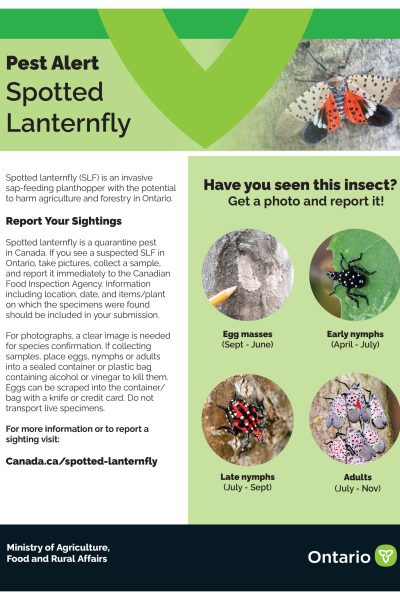 - Ontario Ministry of Agriculture, Food and Rural Affairs. (2023). Pest alert: Spotted lanternfly.