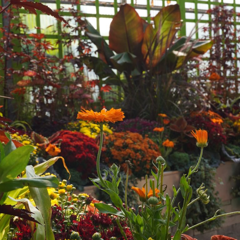 Pictured, left to right: Scented Garden, Goldenrod, Rose Garden, Breezeway displays with Pumpkins, Squash, and Gourds, and Calendula, Chrysanthemums, and Ornamental Kale.